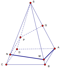 . Do sự cố đường dây điện tải tại điểm Q (là trung điểm của SA) bị hỏng, người ta tạo ra một con đường từ A đến Q gồm bốn đoạn thẳng AM, MN, NP, PQ. Để tiết kiệm chi phí, kĩ sư đã nghiên cứu và có được chiều dài con đường từ A đến Q ngắn nhất. Tính tỷ số $k=\frac{AM+MN}{NP+PQ}$.