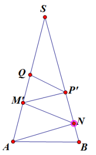 Xét trên mặt phẳng SAB. Lấy các điểm M', P' lần lượt là các điểm đối xứng của M, P qua các đường cao SO. Dễ chứng minh được NM=NM', M'P'=MP.