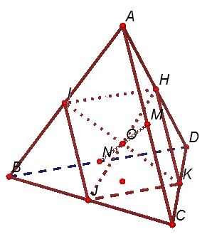 Gọi I, J, K, H, M, N lần lượt là trung điểm AB, BC, CD, DA, AC, BD. Théo tính chất hình bình hành ta chứng minh được IK, JH, MN cắt nhau tại trung điểm mỗi đường, gọi là giao điểm O. Vì tứ diện ABCD đều nên