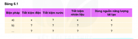 2. Kẻ bảng 6.1 ra Phiếu học tập. Ghi các biện pháp tiết kiệm năng lượng đã chọn ở câu 1 và đánh dấu X vào các cột thích hợp trong bảng. Ví dụ, biện pháp a) đã được đánh dấu "X" vào các cột mô tả tương ứng để minh họa.