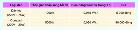3. Bảng số liệu về thời gian thắp sáng tối đa và điện năng tiêu thụ của một số bóng đèn có độ sáng như sau