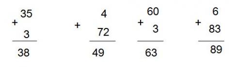 - 56 + 2 : cộng số đơn vị với nhau 6 + 2 = 8, giữ nguyên 5 chục. Vậy 56 + 2 = 58