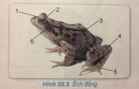 Quan sát ếch đồng trong hình 20.3 và ghi chú thích (chi, mắt, tai, đầu, thân, màng bơi)...