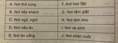 Trong nhà ở một vài khu vực có thể bố trí chung trong cùng một khu vực. Hãy ghép các khu vực trong nhà ở cho dưới đây thành từng nhóm sao cho phù hợp nhất. Ví dụ: Nơi thờ cúng (A) gép với nơi tiếp khách (B).