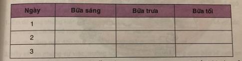 1. Nhớ lại và liệt kê những thức ăn mà em đã ăn trong ba ngày gần đây, ghi theo mẫu trong bảng sau