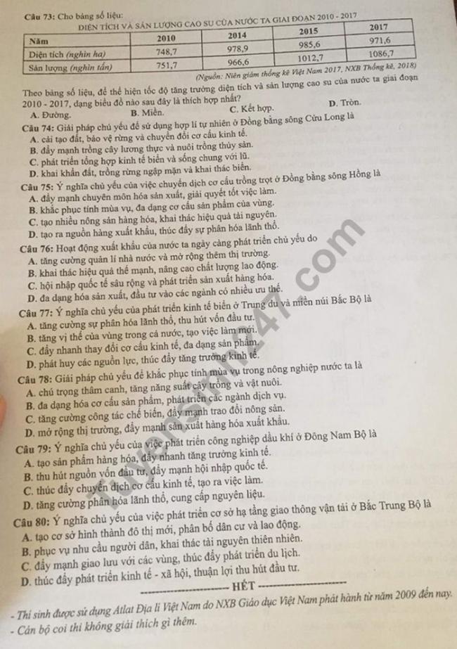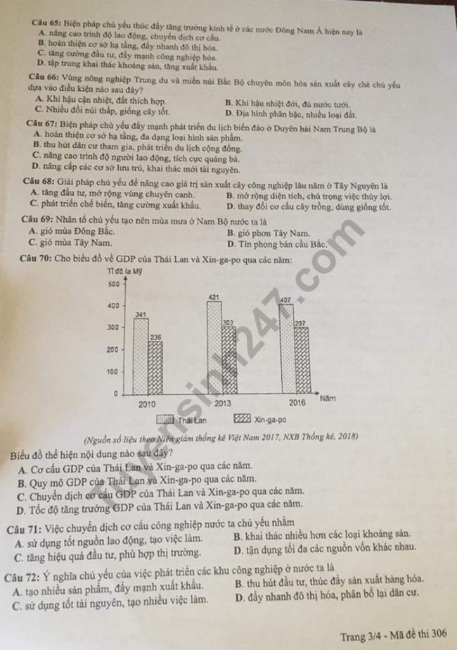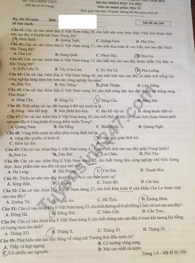 Thi THPQG 2019: Đề thi và đáp án môn Địa lí mã đề 306