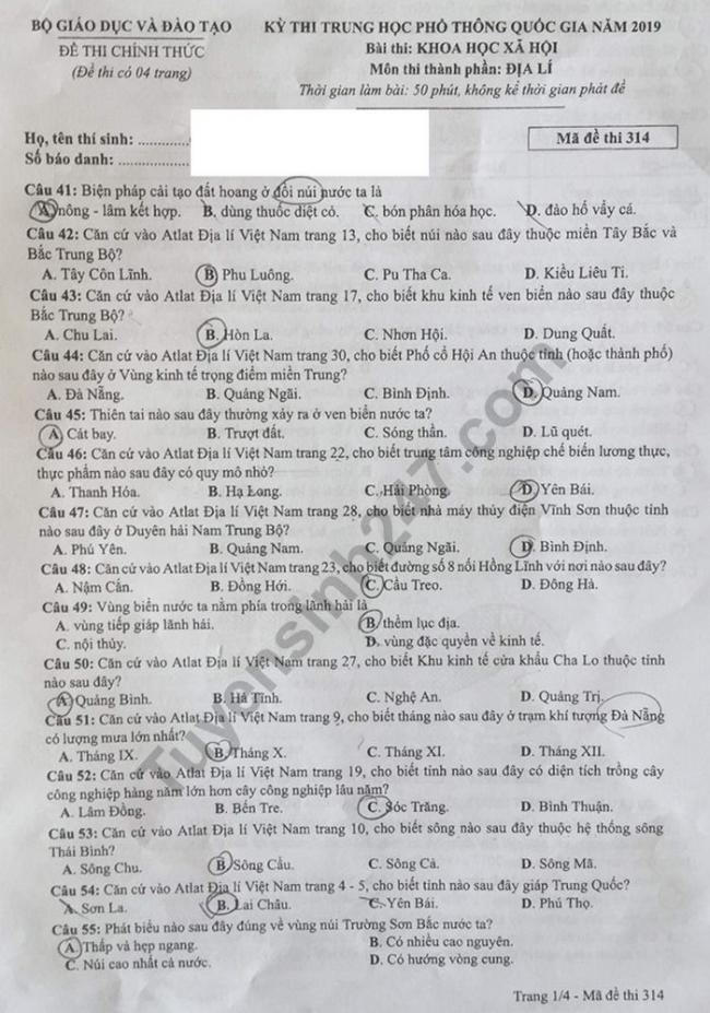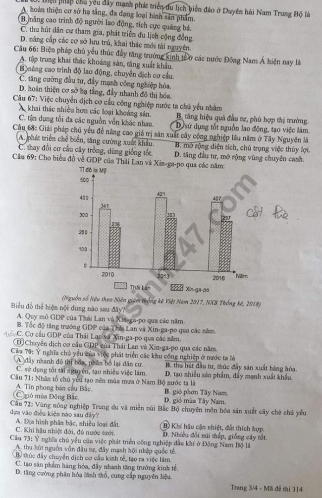Thi THPQG 2019: Đề thi và đáp án môn Địa lí mã đề 314