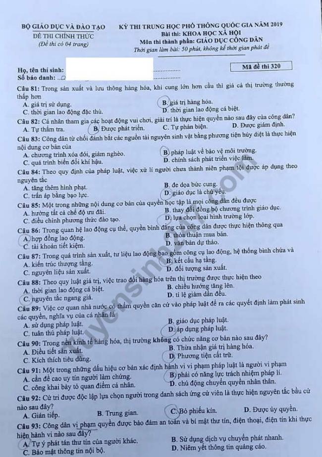 Cập nhật liên tục đề thi và đáp án môn GDCD kì thi THPT quốc gia năm 2019. Dưới đây, KhoaHoc sẽ gửi đến quý phụ huynh và học sinh đề thi và đáp án môn GDCD mã đề 320. Mời quý bạn đọc cùng tham khảo.