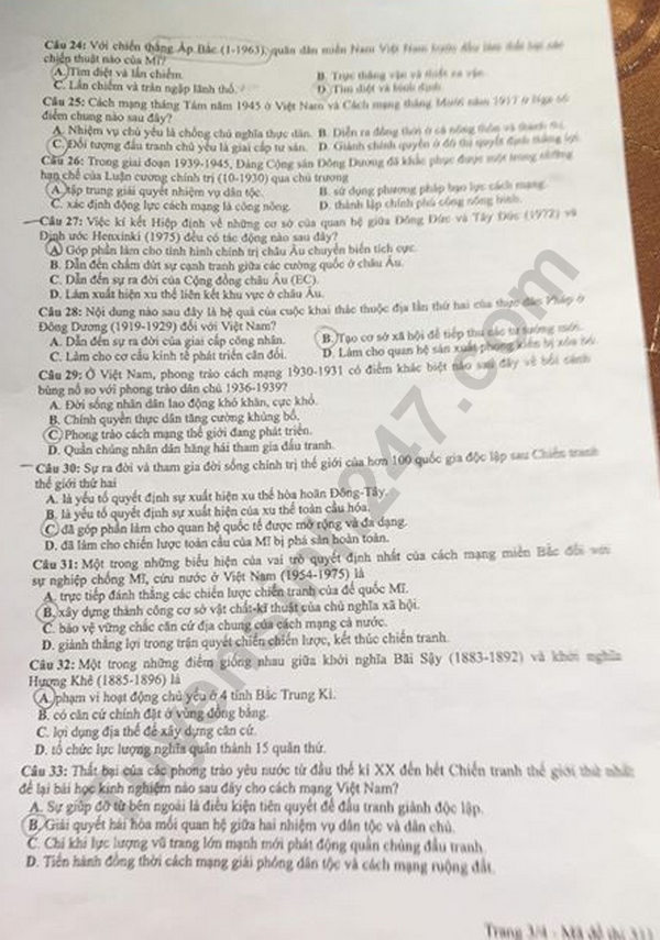 ĐỀ THI MÔN LỊCH SỬ MÃ ĐỀ 311