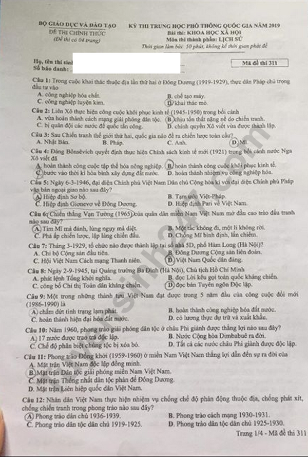 Cập nhật liên tục đề thi và đáp án môn Lịch sử kì thi THPT quốc gia năm 2019. Dưới đây, KhoaHoc sẽ gửi đến quý phụ huynh và học sinh đề thi và đáp án môn Lịch sử mã đề 311. Mời quý bạn đọc cùng tham khảo.