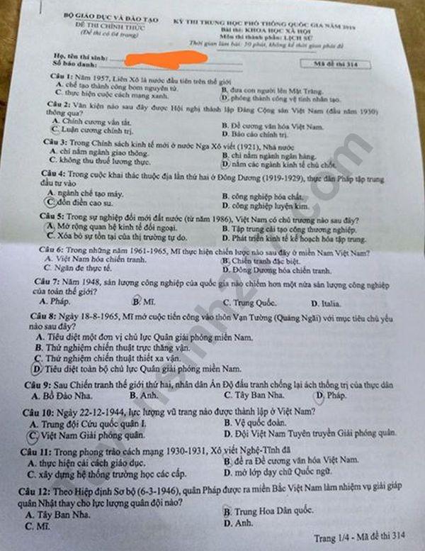 Thi THPQG 2019: Đề thi và đáp án môn Lịch sử mã đề 314