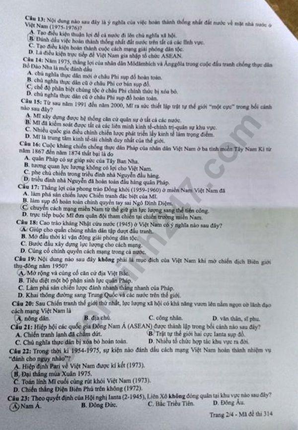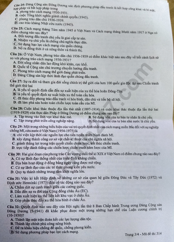 ĐỀ THI MÔN LỊCH SỬ MÃ ĐỀ 314