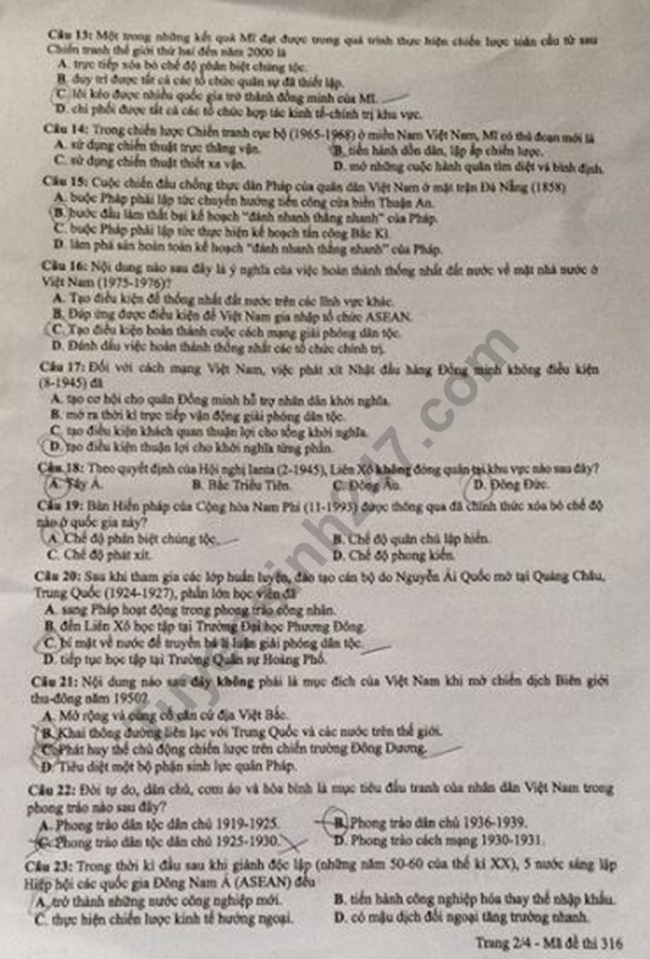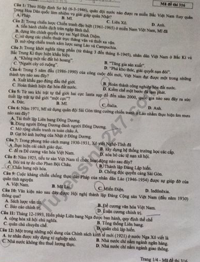 ĐỀ THI MÔN LỊCH SỬ MÃ ĐỀ 316