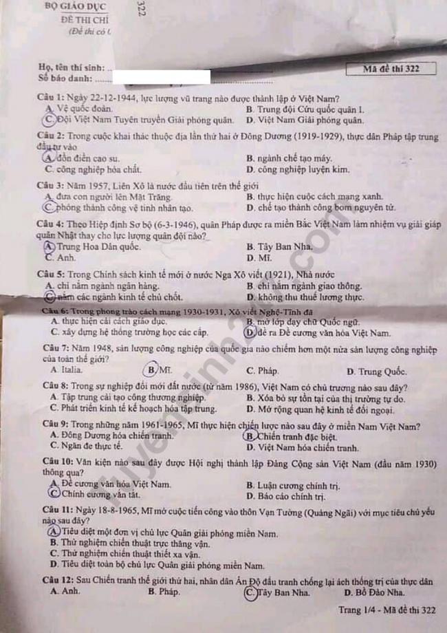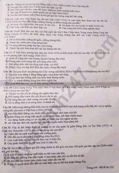 ĐỀ THI MÔN LỊCH SỬ MÃ ĐỀ 322