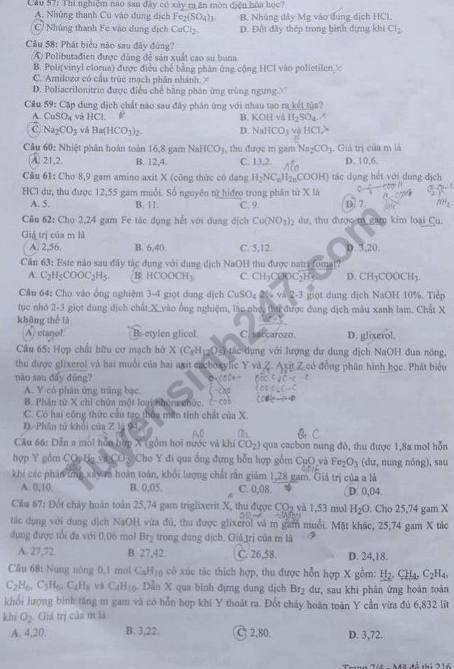 ĐỀ THI MÔN HÓA, MÃ ĐỀ 216