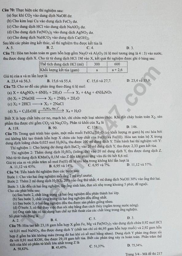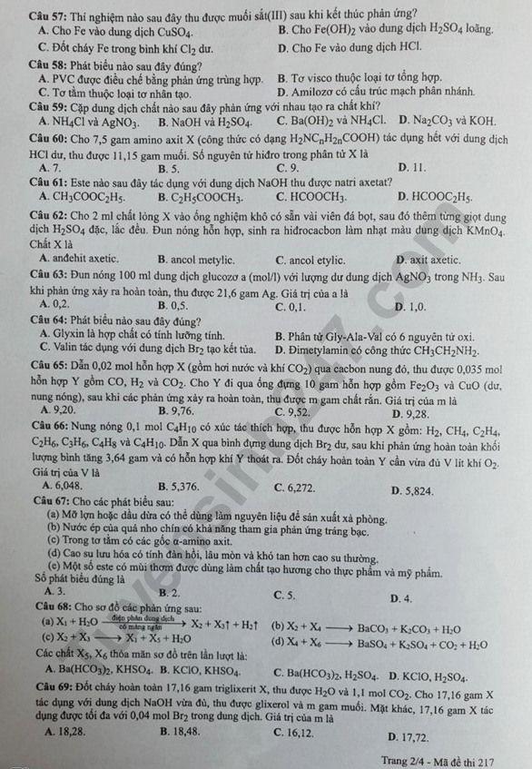 ĐỀ THI MÔN HÓA, MÃ ĐỀ 217