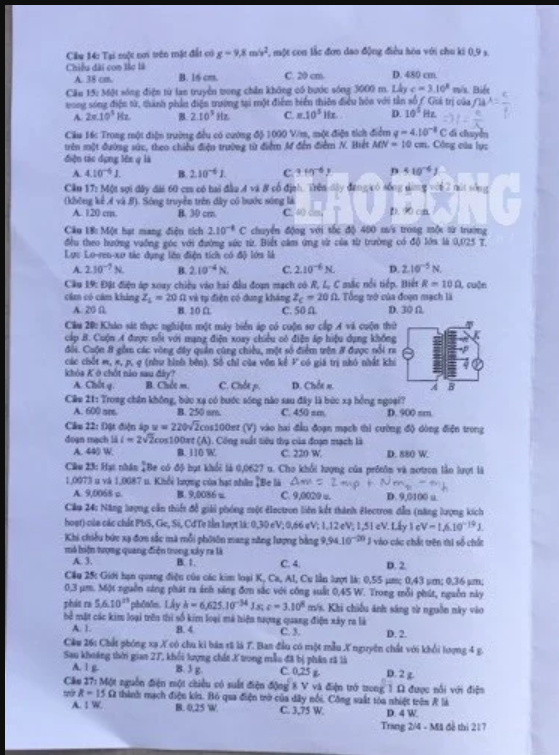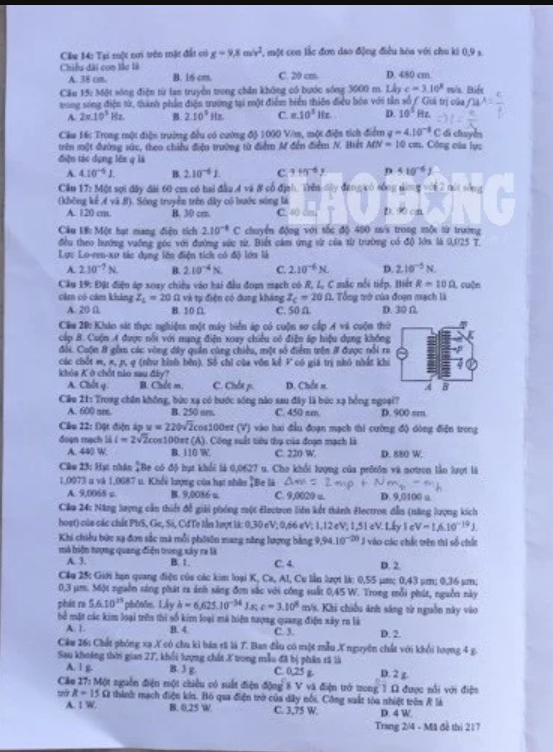 ĐỀ THI MÔN VẬT LÝ MÃ ĐỀ 217
