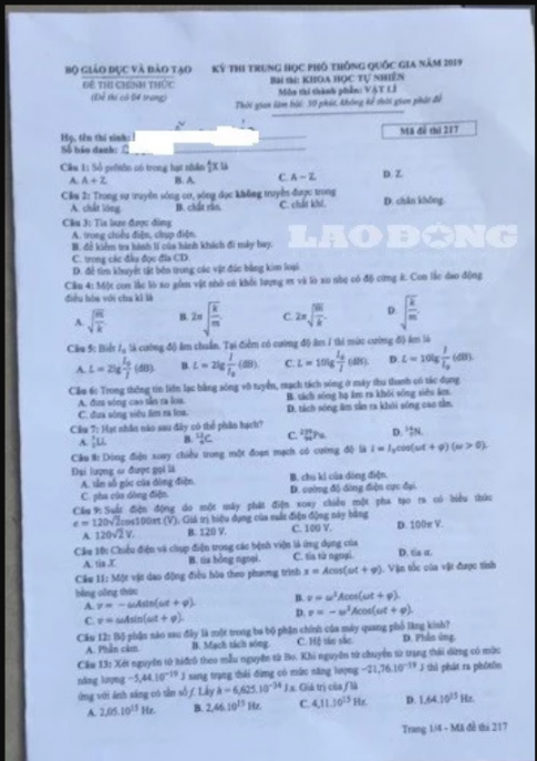 Cập nhật liên tục đề thi và đáp án môn Vật lý kì thi THPT quốc gia năm 2019. Dưới đây, KhoaHoc sẽ gửi đến quý phụ huynh và học sinh đề thi và đáp án môn Vật lý mã đề 217. Mời quý bạn đọc cùng tham khảo.