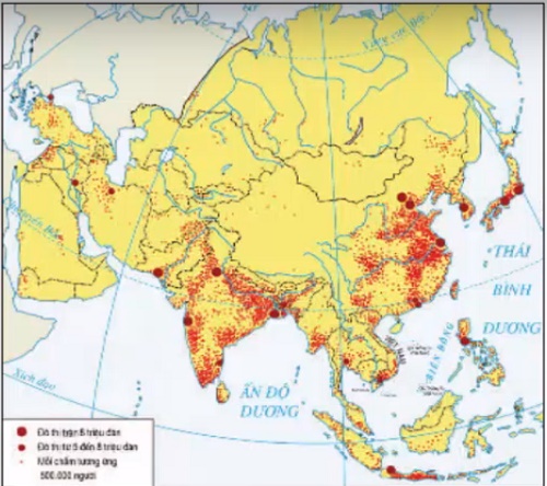 Câu 3: Tìm trên lược đồ phân bố dân cư Châu Á những khu vực tập trung đông dân. Các đô thị lớn ở Châu Á thường phân bố ở đâu?