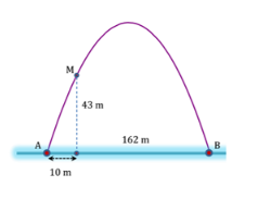 Câu 18: Cổng Arch tại thành phố St Louis của Mỹ có hình dạng là một parabol (hình vẽ). Biết khoảng cách giữa hai chân cổng bằng 162m. Trên thành cổng, tại vị trí có độ cao 43m so với mặt đất (điểm M), người ta thả một sợi dây chạm đất (dây căng thẳng theo phương vuông góc với đất). Vị trí chạm đất của đầu sợi dây này cách chân cổng A một đoạn 10m. Giả sử các số liệu trên là chính xác. Hãy tính độ cao của cổng Arch (tính từ mặt đất đến điểm cao nhất của cổng).