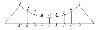 Câu 4: Dây truyền đỡ trên cầu treo có dạng Parabol ACB như hình vẽ. Đầu, cuối của dây được gắn vào các điểm A, B trên mỗi trục AA′ và BB′ với độ cao 30m. Chiều dài đoạn A′B′ trên nền cầu bằng 200m. Độ cao ngắn nhất của dây truyền trên cầu là C′C = 5 m. Gọi Q′, P′, H′, C′, I′, J′, K′ là các điểm chia đoạn A′B′ thành các phần bằng nhau. Các thanh thẳng đứng nối nền cầu với đáy dây truyền: QQ′, PP′, HH′, C′C, II′, JJ′, KK′ gọi là các dây cáp treo. Tính tổng độ dài của các dây cáp treo?
