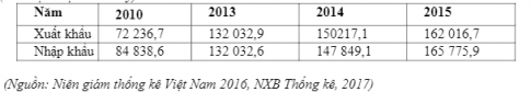 Căn cứ vào bảng số liệu, cho biết nhận xét nào sau đây đúng về giá trị xuất, nhập khẩu của nước ta, giai đoạn 2010 -2015?