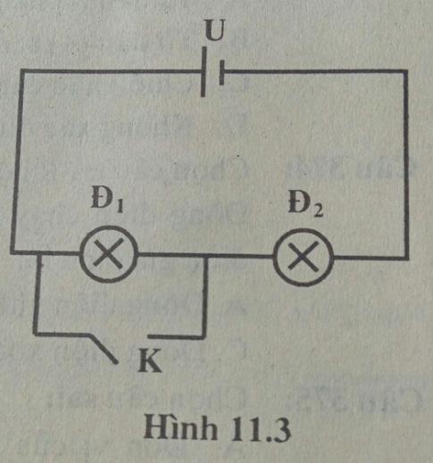 Câu 10: Chọn câu trả lời sai.Cho một đoạn mạch điện như hình 11.3. Đèn Đ1 và đèn Đ2. Điện trở khóa K bằng không
