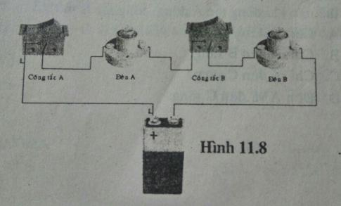 Mạch điện được bố trí như hình 11.8. Đèn A và B sáng khi: