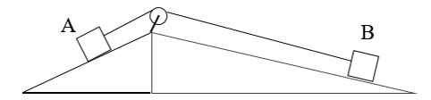 Câu 18: Hai vật A, B có cùng khối lượng nằm trên hai mặt phẳng nghiêng và được nối với nhau bằng một sợi dây vắt qua một ròng rọc (hình vẽ). Chiều dài mặt phẳng nghiêng có vật A là lA; chiều dài mặt phẳng nghiêng có vật B là lB. Kết luận nào dưới đây là đúng?