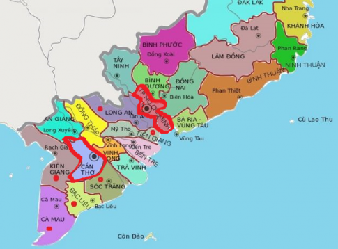 Vị trí của thành phố Hồ Chí Minh và thành phố Cần Thơ trên bản đồ: