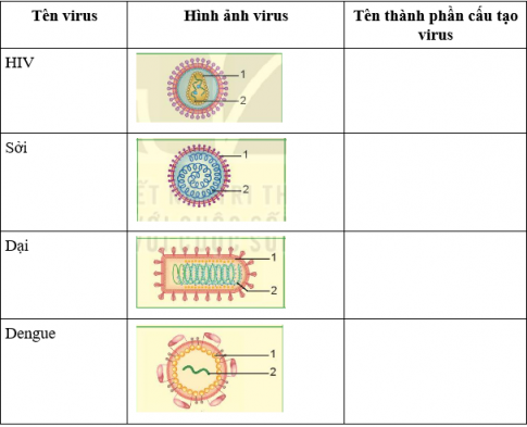 Hoạt động: Dựa trên hình dạng và cấu tạo của virus mà em đã học, quan sát các hình trong bảng, nêu tên các thành phần được chú thích trong hình và hoàn thành bảng theo mẫu sau: