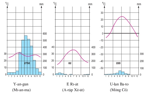 Câu 1: Dựa vào các biểu đồ nhiệt độ và lượng mưa của ba địa điểm dưới đây em hãy cho biết: