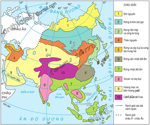 - Rừng cận nhiệt ở Đông Á, rừng nhiệt đới ẩm ở Đông Nam Á và Nam Á.