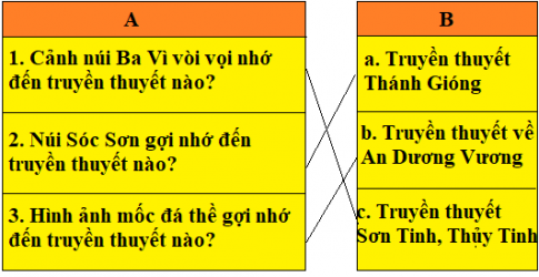 Bài văn gợi cho em nhớ đến một số truyền thuyết về sự nghiệp dựng nước và giữ nước của dân tộc, đó là những truyền thuyết nào? Nối câu hỏi ở cột A với câu trả lời ở cột B cho phù hợp:
