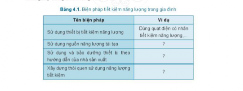 4. Nêu ví dụ cụ thể của các biện pháp giúp tiết kiệm năng lượng trong gia đình em theo gợi ý trong mâu Bảng 4.1.