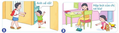 - Tranh 2: Chị làm rơi hộp bút, em nhắc chị: “Hộp bút của chị rơi kìa!”.