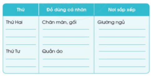• Xây dựng thời gian biểu sắp xếp đồ dùng cá nhân theo mẫu gợi ý.