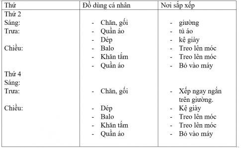 4. Thời gian biểu sắp xếp đồ dùng cá nhân tại gia đình