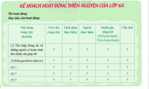 Lập kế hoạch cho hoạt động thiện nguyện của lớp đẻ giúp đỡ những người có hoàn cảnh khó khăn theo gợi ý: