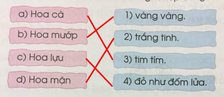 1. Mỗi loài hoa trong bài có màu sắc riêng. Ghép đúng (trang 132 sgk)