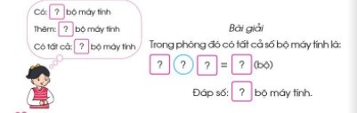 Trong phòng máy có 9 bộ máy tính, người ta mang thêm vào 3 bộ. Hỏi trong phòng đó có tất cả bao nhiêu bộ máy tính?