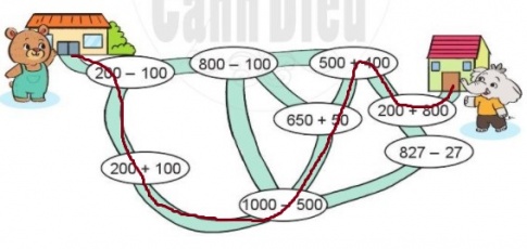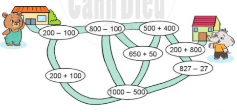 Bạn Gấu phải đi qua các vị trí ghi phép tính có kết quả lần lượt là 100, 300, 500, 700, 900, 1000 để đến nhà bạn Voi. Hãy chỉ đường giúp bạn Gấu