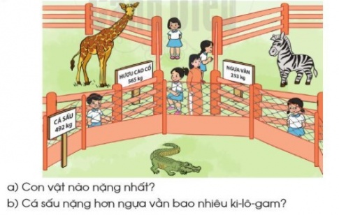 b) Cá sấu nặng hơn ngựa vằn: 492 - 253 = 239 ( kg)