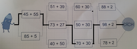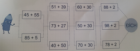 Bài 5. Để về đích, bạn bút chì phải vượt qua thử thách là tìm ra đường đi qua các ô chứa phép tính có kết quả bằng 100. Em hãy vẽ đường giúp bạn bút chì tìm đúng đường cần đi: