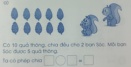 - Có 10 đĩa bánh xếp đều vào các bàn. Mỗi bàn bỏ 2 đĩa bánh. Xếp đủ cho 5 bàn.