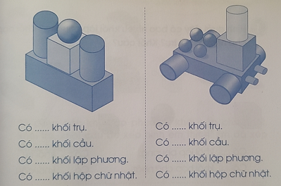 Bài 3. Mỗi hình trụ sau có bao nhiêu khối trụ? Khối cầu? Khối lập phương? Khối hộp chữ nhật?