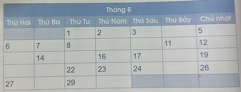 a) Ngày còn thiếu trong tờ lịch tháng 6: 4, 9, 10, 13, 15, 18, 20, 21, 25, 28, 30
