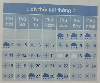 Bài 3. Xem lịch dự báo thời tiết trong tháng 7, trả lời các câu hỏi: