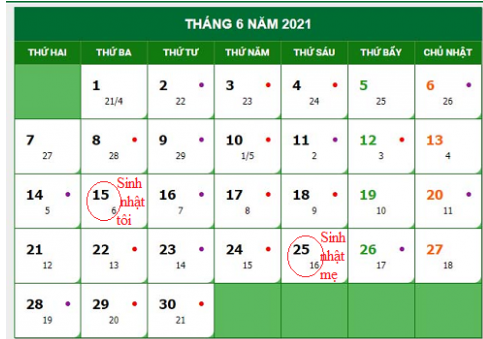 Bài 4. Thực hành: Lấy một tờ lịch tháng rồi đánh dấu và ghi chú những ngày có sự kiện đặc biệt trong tờ lịch của em.