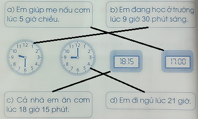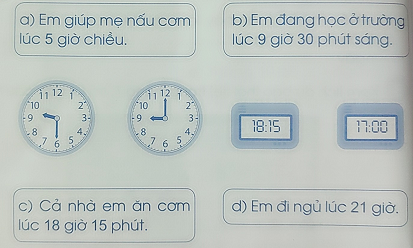 Bài 1. Nối mỗi câu với đồng hồ thích hợp: